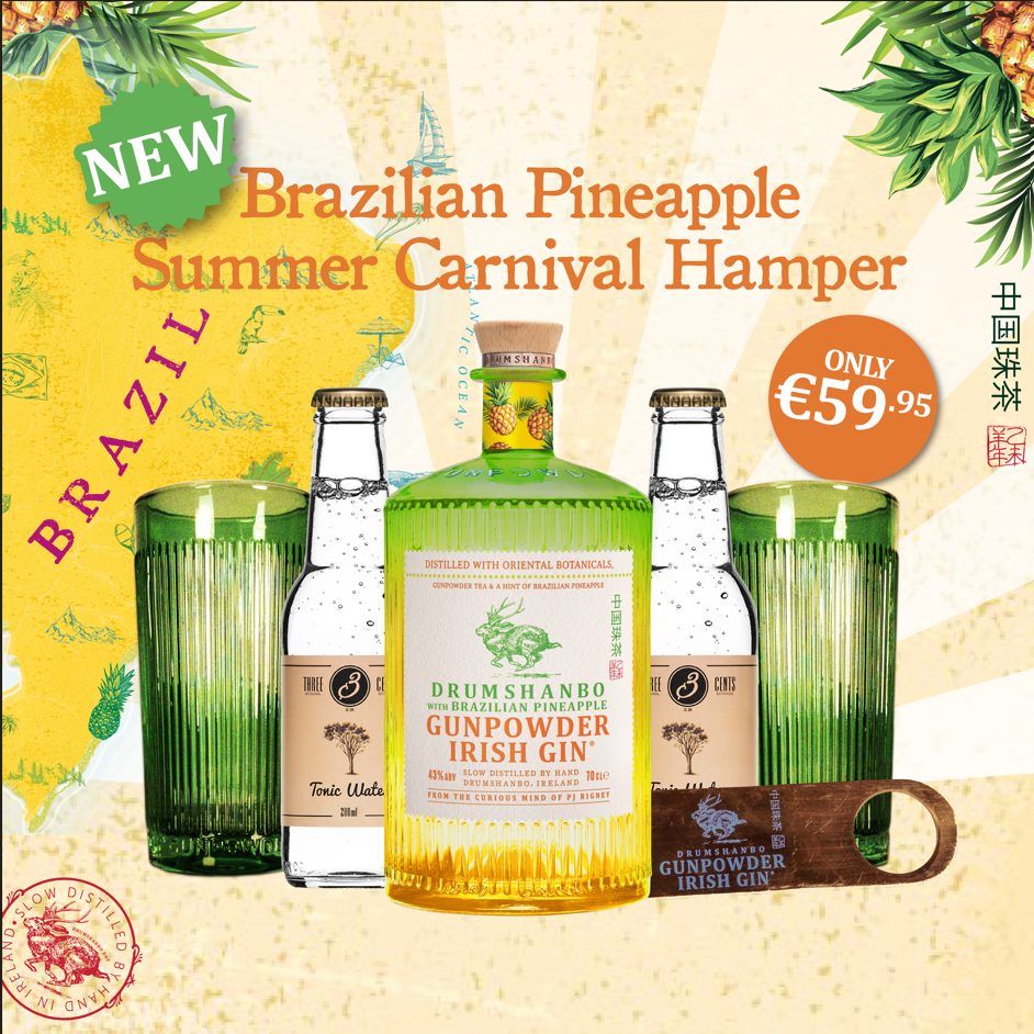 x 1 Drumshanbo Gunpowder Irish Gin with Brazilian Pineapple (700ml), x2 Drumshanbo Green Gin Glasses, x2 Premium Tonic Waters, x1 Drumshanbo Copper Barblade
